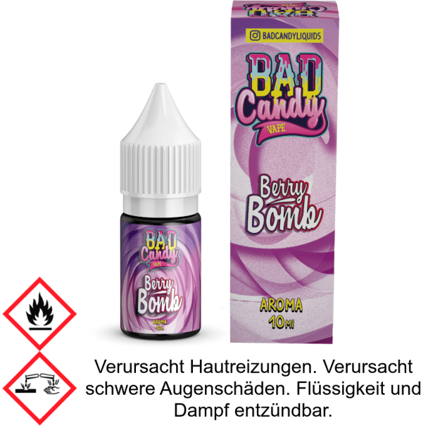 Von der Liquidmarke Bad Candy kommt das Aroma Berry Bomb mit 10 ml in einer 10 ml Flasche. In Kombination mit Ihrer E-Zigarette entwickelt sich der Geschmack von einem Mix aus verschiedenen Beeren. Da das Aroma hochkonzentriert ist, sollte das Berry Bomb Aroma nicht unverdünnt gedampft werden.
