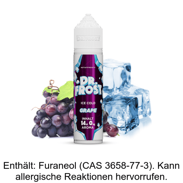 Sie mögen den Geschmack von eisgekühlten Trauben? Dann könnte das Dr. Frost Aroma Grape Ice möglicherweise genau Ihren Geschmack treffen. Es handelt sich um ein Longfill-Aroma, bei dem Sie pro bestellter Packung eine 60ml Flasche erhalten, die mit insgesamt 14ml des Aromas vorgefüllt ist. Bitte beachten Sie, dass ein Longfill-Aroma eine höhere Konzentration aufweist und daher nicht pur gedampft werden sollte.