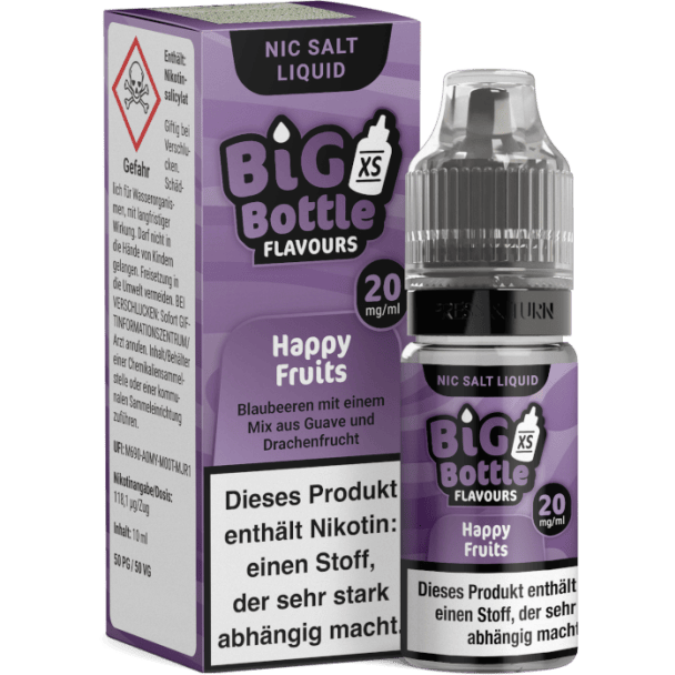 Das Happy Fruits Nikotinsalz Liquid stammt aus dem Hause Big Bottle. Beim Dampfen schmeckt es nach Blaubeere, Guave und Drachenfrucht. Sie erhalten pro bestellter Einheit eine 10 ml Flasche mit 10 ml Inhalt. Das Nikotinsalz Liquid können Sie mit 10 mg/ml oder 20 mg/ml Nikotin dampfen. Es ist für den direkten Gebrauch in Ihrer E-Zigarette geeignet.