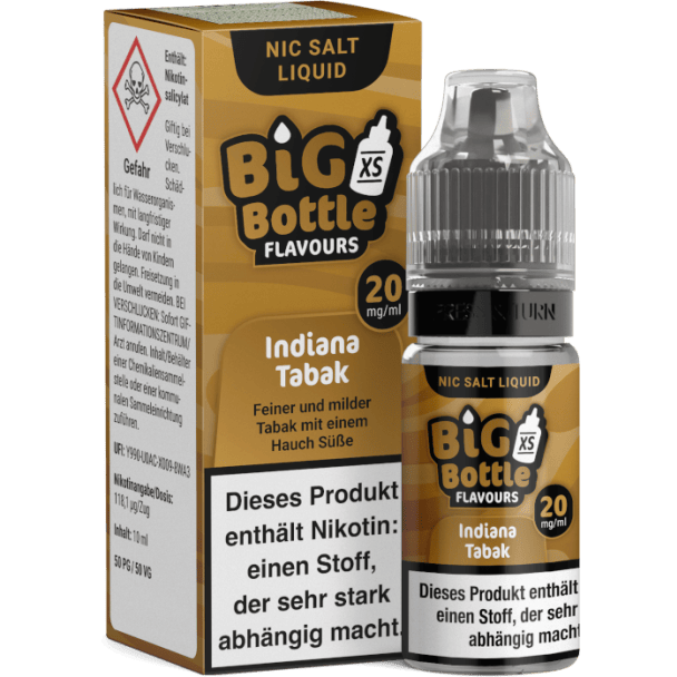 Das Indiana Tabak Nikotinsalz Liquid stammt aus dem Hause Big Bottle. Beim Dampfen schmeckt es nach Tabak mit einer süßen Note. Sie erhalten pro bestellter Einheit eine 10 ml Flasche mit 10 ml Inhalt. Das Nikotinsalz Liquid können Sie mit 10 mg/ml oder 20 mg/ml Nikotin dampfen. Es ist für den direkten Gebrauch in Ihrer E-Zigarette geeignet.