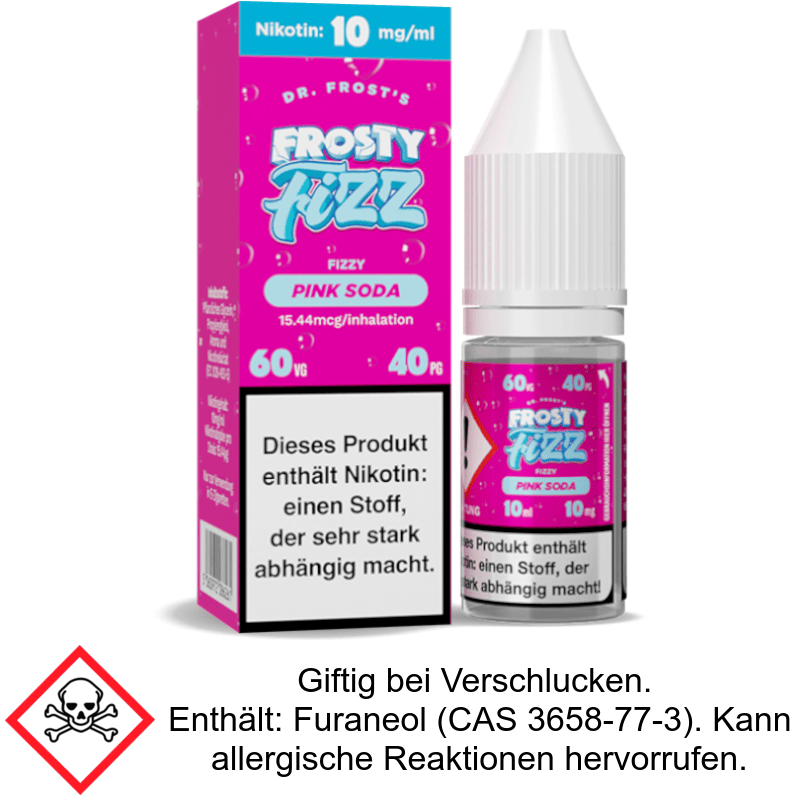 Das von Dr. Frost produzierte Nikotinsalz Liquid Frosty Fizz - Pink Soda wird in Ihrer E-Zigarette den Geschmack von pinker Soda entfalten. Sie erhalten 10 ml Liquid pro bestellter Flasche. Der Nikotingehalt beläuft sich auf 20 mg/ml.