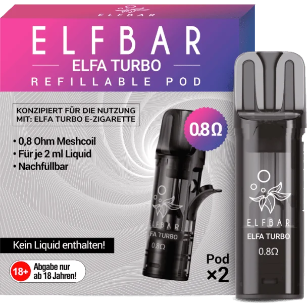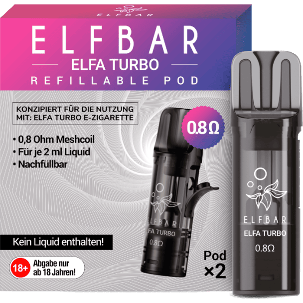 Der Elfa Turbo Pod hat ein Fassungsvermögen von 2 ml und ist wiederbefüllbar. Im Pod ist ein fest verbauter 0,8 Ohm Head integriert, der sowohl RDL- als auch MTL-Dampfen ermöglicht, wenn das Pod-System mit dem passenden Elfa Turbo Akku mit 550 mAh verwendet wird. Befüllt wird der Tank über das Side-Filling-System. Jede Packung enthält zwei Elfbar Elfa Turbo Pods. Um den reinen Geschmack des Liquids zu erhalten, sollten die Pods regelmäßig ausgetauscht werden.