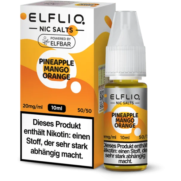 Das Pineapple Mango Orange Nikotinsalz Liquid aus dem Hause ELFLIQ schmeckt beim Dampfen nach Ananas, Mango und Orange. Sie erhalten pro bestellter Einheit eine 10 ml Flasche mit 10 ml Inhalt. Das Nikotinsalz Liquid hat je nach Ihrer Auswahl einen Nikotingehalt von 10 mg/ml oder 20 mg/ml. Das Nikotinsalz Liquid ist für den direkten Gebrauch in Ihrer E-Zigarette geeignet.