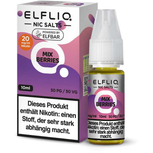 Das ELFLIQ Nikotinsalz Liquid Mix Berries bietet ein Beerenaroma und ist als gebrauchsfertiges Liquid in einer 10 ml Flasche erhältlich. Es kann mit 10 mg/ml oder 20 mg/ml Nikotin erworben werden.