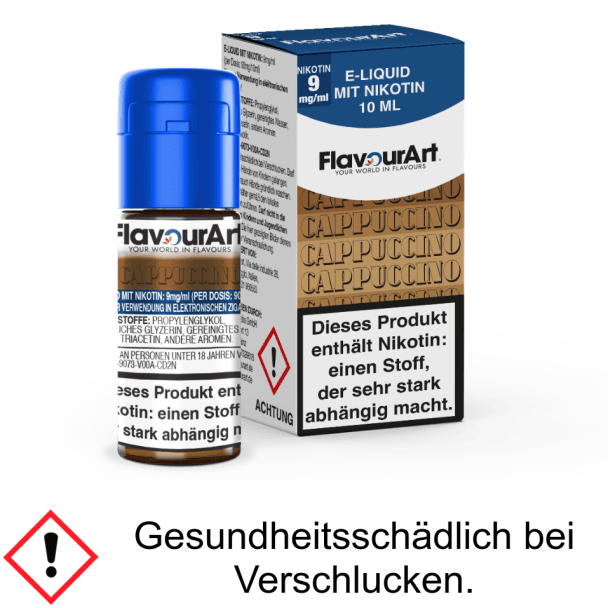 Für den Gebrauch in elektronischen Zigaretten ist das "Cappuccino" Liquid der Marke FlavourArt konzipiert, welches ein Cappuccino-Aroma aufweist. Die verfügbaren Nikotingehalte dieses in 10 ml Flaschen abgefüllten Produkts sind 4,5 mg/ml, 9 mg/ml und 18 mg/ml.