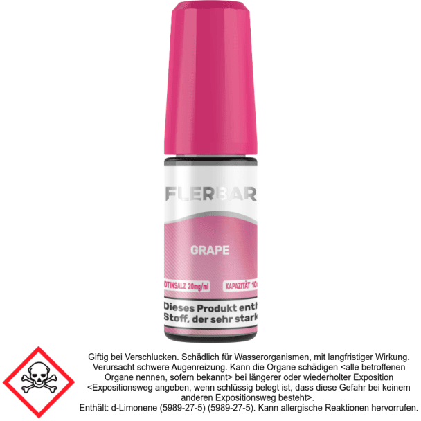 Das Nikotinsalz Liquid Grape von Flerbar zeichnet sich durch den Geschmack von Traube aus, der beim Dampfen mit einer E-Zigarette entsteht. Das Liquid ist in den Nikotinstärken 10 mg/ml und 20 mg/ml erhältlich. Es wird in einer 10 ml Flasche geliefert und ist sofort einsatzbereit.