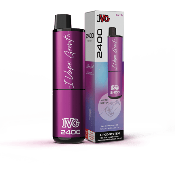 Der IVG 2400 Akku ist wiederaufladbar und besitzt eine Akkukapazität von 1.000 mAh. Falls die Energie erschöpft ist, kann er über den USB-C Anschluss aufgeladen werden. Der IVG 2400 Akku agiert als Basisgerät und ist auch als 4-Pod-System bekannt. Das IVG 2400 Basisgerät ermöglicht die Verwendung von insgesamt vier vorgefüllten IVG 2400 Pods, wodurch die Auswahl zwischen vier unterschiedlichen Geschmacksrichtungen möglich ist. Die Geschmacks Wechsel sind durch einfaches Drehen möglich. Die Bedienung des Geräts ist simpel dank der Zugautomatik, welche keine manuellen Einstellungen beim Dampfen erfordert. Mit dem IVG 2400 4-Pod-System Basisgerät, das alle vier Pods (jeweils mit 2 Millilitern Liquid) nutzt, sind bis zu 2400 Züge möglich. Beachten Sie, dass die tatsächliche Anzahl variieren kann, abhängig vom individuellen Nutzerverhalten.