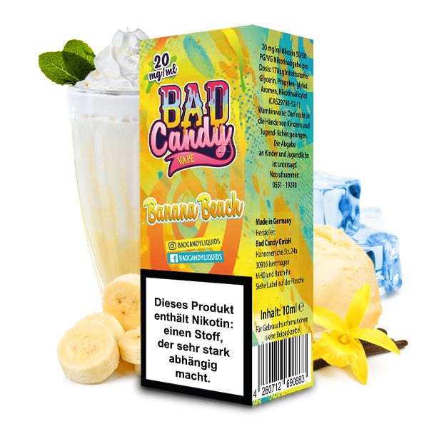 Mit dem Liquid Banana Beach aus dem Hause Bad Candy Liquids erhalten Sie ein Nikotinsalz Liquid, das zum puren Dampfen geeignet ist. Beim Vapen entwickelt es den Geschmack von Banane, Milch, Vanille-Eis und Koolada. Erhältlich ist das Nikotinsalz Liquid in den Stärken 10 mg/ml und 20 mg/ml. Pro bestellter Einheit erhalten Sie eine 10 ml Flasche mit 10 ml Inhalt.