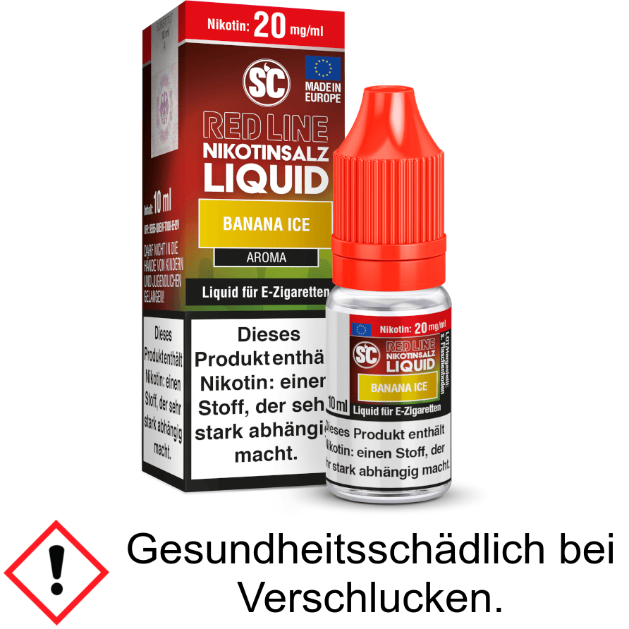 Mit dem Nikotinsalz Liquid Banana Ice aus der Serie Red Line von SC erhalten Sie ein Liquid, welches beim Dampfen den intensiven Geschmack von Bananen und einer kühlen Note freisetzt. Die Red Line Nikotinsalz Liquids sind gebrauchsfertige Liquids und daher für den direkten Gebrauch in Ihrer E-Zigarette geeignet. Die Red Line Nikotinsalz Liquids erhalten Sie wahlweise in den Stärken mit 10 mg/ml und 20 mg/ml.