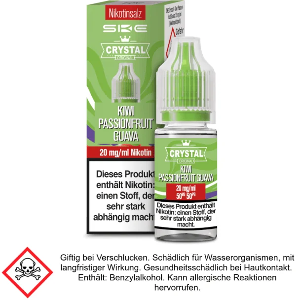 Pro 10 ml Flasche erhalten Sie Niktoinsalz Liquid der Marke SKE. Die Sorte Crystal Kiwi Passionfruit Guava entfaltet beim Verdampfen mit einer E-Zigarette den Geschmack von Passionsfrucht, Kiwi und Guave. Die Stärke der SKE Nikotinsalz Liquids beträgt 20 mg/ml.