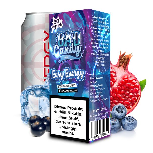 Mit dem Liquid Easy Energy aus dem Hause Bad Candy Liquids erhalten Sie ein Nikotinsalz Liquid, das zum puren Dampfen geeignet ist. Beim Vapen entwickelt es den Geschmack von Blaubeere, Acai-Beere und Granatapfel. Erhältlich ist das Nikotinsalz Liquid in den Stärken 10 mg/ml und 20 mg/ml. Pro bestellter Einheit erhalten Sie eine 10 ml Flasche mit 10 ml Inhalt.
