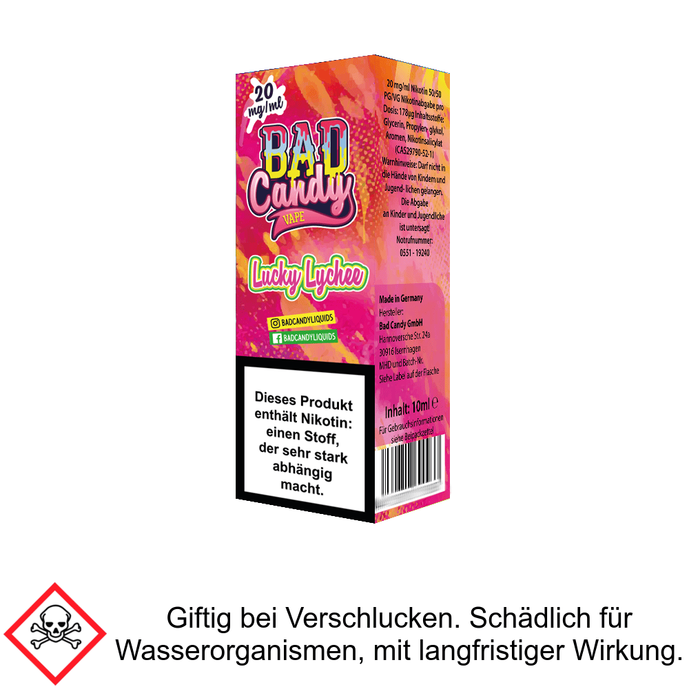 Mit dem Liquid Lucky Lychee aus dem Hause Bad Candy Liquids erhalten Sie ein Nikotinsalz Liquid, welches zum puren Dampfen geeignet ist. Beim Vapen entwickelt es den Geschmack von Lychee, Maracuja, Zitrone und Frische. Erhältlich ist das Nikotinsalz Liquid in der Stärke 20 mg/ml. Pro bestellter Einheit erhalten Sie eine 10 ml Flasche mit 10 ml Inhalt.
