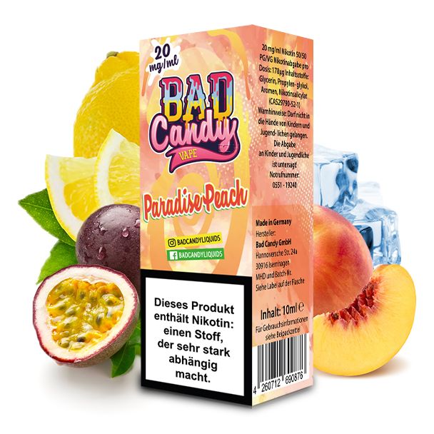 Mit dem Liquid Paradise Peach aus dem Hause Bad Candy Liquids erhalten Sie ein Nikotinsalz Liquid, welches zum puren Dampfen geeignet ist. Beim Vapen entwickelt es den Geschmack von Pfirsich, Maracuja, Zitrone und Koolada. Erhältlich ist das Nikotinsalz Liquid in den Stärken 10 mg/ml und 20 mg/ml. Pro bestellter Einheit erhalten Sie eine 10 ml Flasche mit 10 ml Inhalt.
