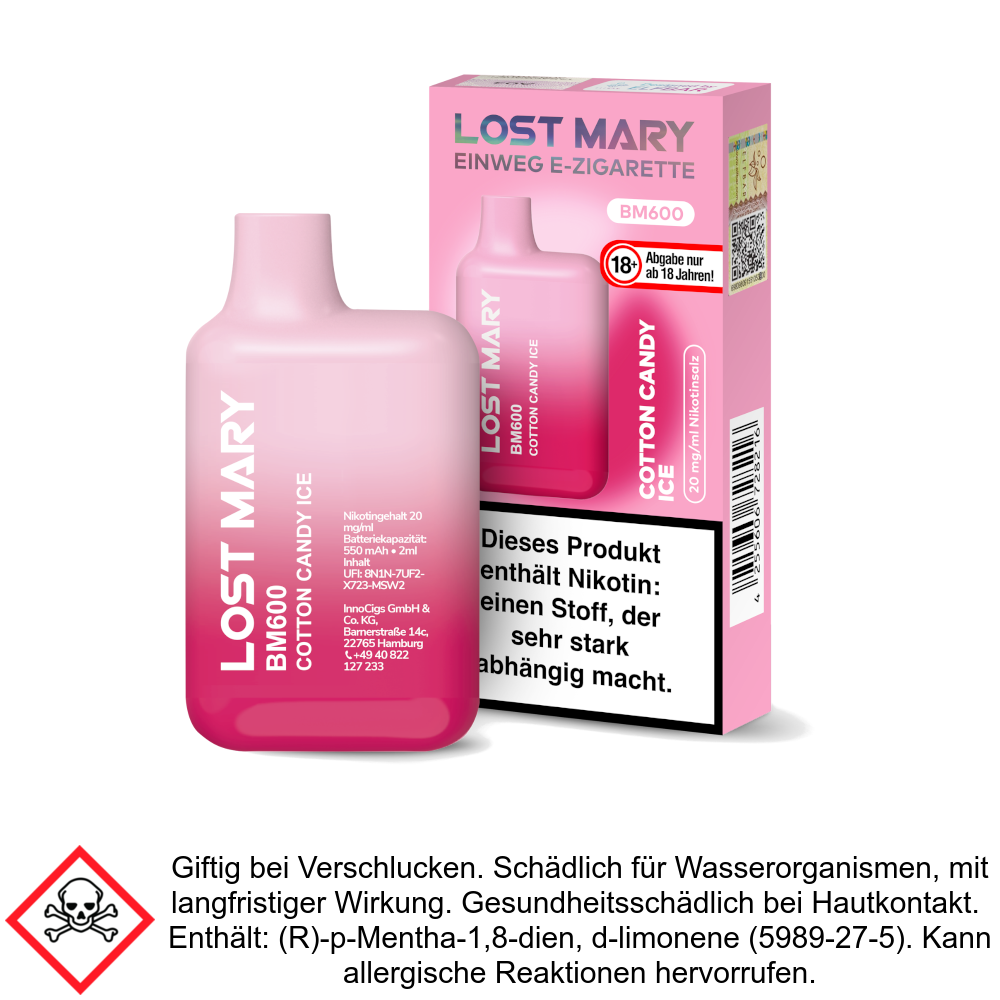 Mit der Lost Mary BM600 Einweg E-Zigarette erleben Sie ein unkompliziertes und genussvolles Dampfen. Der einzigartige Geschmack von zuckerwatte-eis sorgt für eine erfrischende und süße Abwechslung. Dank des hochwertigen Nikotinsalzes können Sie Ihr Verlangen nach Nikotin auf sanfte Weise befriedigen. Verlassen Sie sich auf die Herstellerqualität von Lost Mary und genießen Sie das Dampfen ohne lästiges Nachfüllen oder Aufladen. Bestellen Sie jetzt die Lost Mary BM600 Einweg E-Zigarette - Ihr neuer Begleiter für entspannte Dampfmomente!