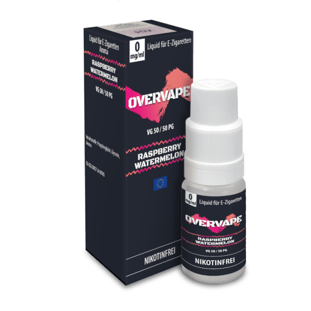 Das Nikotinsalz-Liquid "Raspberry Watermelon" der Marke Overvape ist in den Nikotinstärken 0 mg/ml, 5 mg/ml, 10 mg/ml sowie 20 mg/ml erhältlich. Sie erhalten pro Flasche 10 ml des "Raspberry Watermelon" Nikotinsalzes. Beim Dampfen dieses Liquids entfaltet sich ein Aroma von Himbeeren und Wassermelonen.