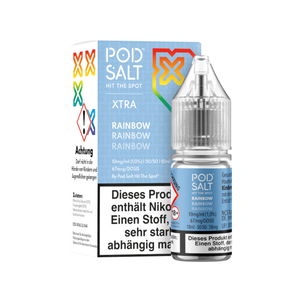 Das Rainbow Nikotinsalz Liquid von Pod Salt X schmeckt beim Dampfen nach fruchtigen Süßigkeiten. Sie erhalten pro bestellter Einheit eine 10 ml Flasche mit 10 ml Inhalt. Das Nikotinsalz Liquid können Sie mit 10 mg/ml oder 20 mg/ml Nikotin dampfen. Es ist für den direkten Gebrauch in Ihrer E-Zigarette geeignet.