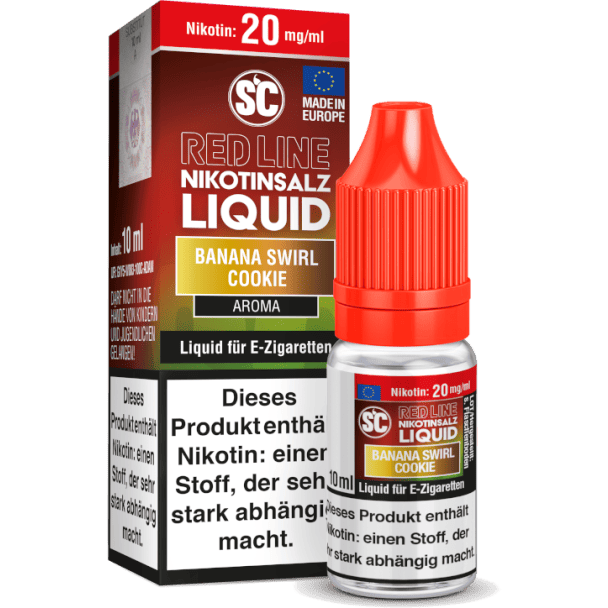 Mit dem Nikotinsalz Liquid Banana Swirl Cookie aus der Serie Red Line von SC erhalten Sie ein Liquid, welches beim Dampfen den intensiven Geschmack von einem Bananenstrudelplätzchen freisetzt. Die Red Line Nikotinsalz Liquids sind gebrauchsfertige Liquids und daher für den direkten Gebrauch in Ihrer E-Zigarette geeignet. Die Red Line Nikotinsalz Liquids erhalten Sie wahlweise in den Stärken mit 0 mg/ml, 10 mg/ml und 20 mg/ml.
