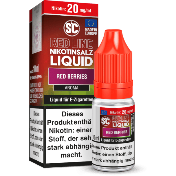 Mit dem Nikotinsalz Liquid Red Berries aus der Serie Red Line von SC erhalten Sie ein Liquid, welches beim Dampfen den intensiven Geschmack von verschiedenen roten Früchten freisetzt. Die Red Line Nikotinsalz Liquids sind gebrauchsfertige Liquids und daher für den direkten Gebrauch in Ihrer E-Zigarette geeignet. Die Red Line Nikotinsalz Liquids erhalten Sie wahlweise in den Stärken mit 10 mg/ml und 20 mg/ml.