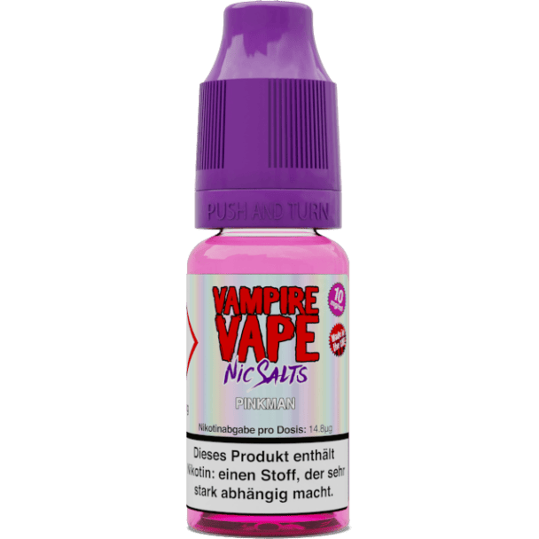 Bei den Vampire Vape Nikotinsalz Liquids haben Sie die Wahl zwischen 10 mg/ml und 20 mg/ml. Pro Variante und Flasche sind insgesamt 10 ml Vampire Vape Nikotinsalz Liquid enthalten. Die Sorte Pinkman kann direkt gedampft werden und entwickelt beim Dampfen den Geschmack von einem Mix aus verschiedenen Beeren mit einer Note von Zitrone.